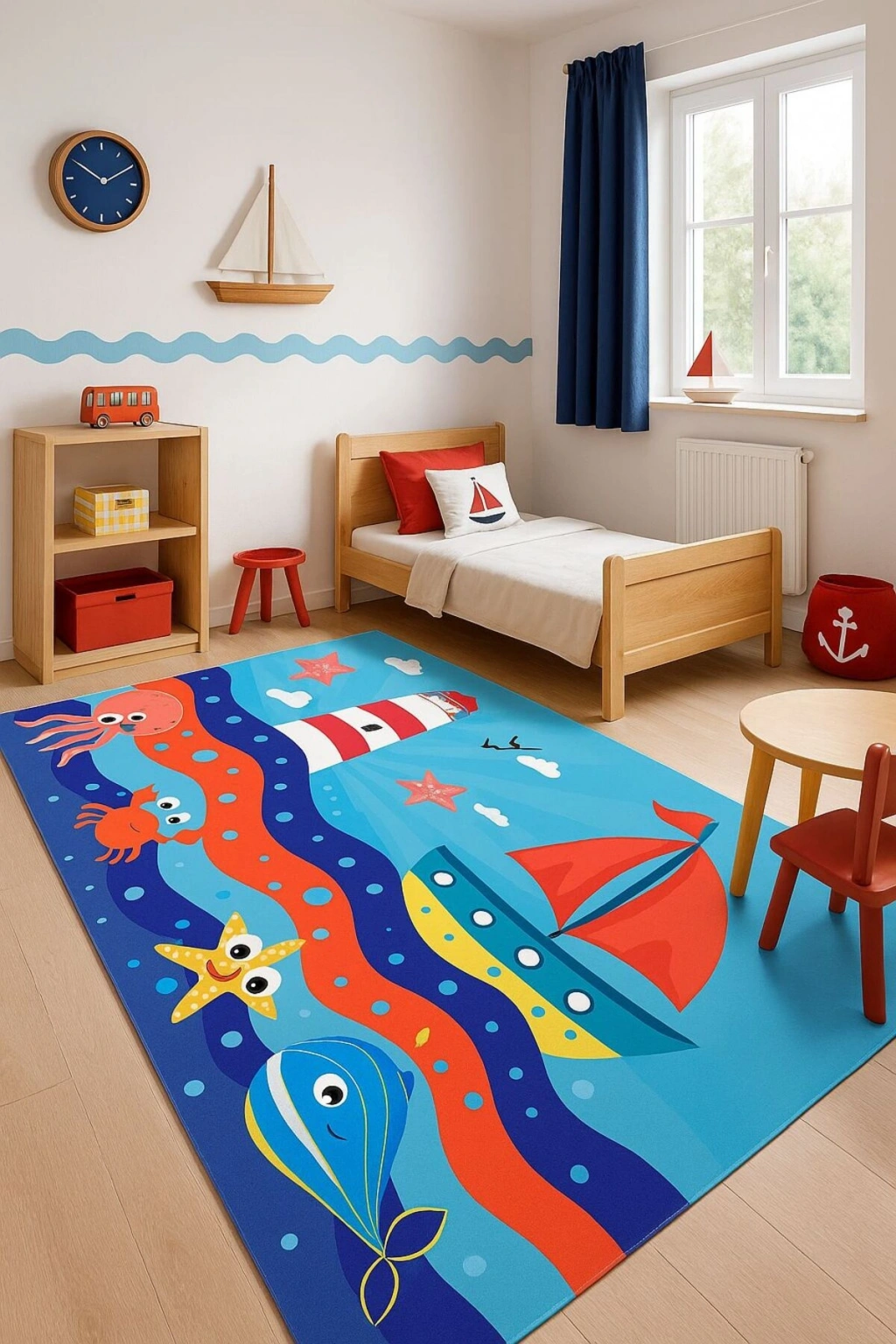 - Deniz ve sandal temalı tasarımıyla çocuk odalarına neşe katan, figürlerle süslenmiş dikdörtgen halı.; - Dayanıklı dokuma tabanı sayesinde uzun süreli kullanım sunar ve çocukların oyun alanları için idealdir.; - Doğal bambu materyali ile hem çevre dostu hem de yumuşak bir dokunuş sağlar; ayakların rahat etmesini garanti eder.; - Sade ve şık görünümüyle her türlü çocuk odası dekorasyonuna kolayca uyum sağlayan düz saçaklı tasarım.; - Orta hav yüksekliği (6 - 12 mm),konforlu bir yürüyüş deneyimi sunarken aynı zamanda kolay temizlenebilirlik özelliğiyle pratiklik kazandırır.; - Makine halısı üretim tekniği ile üretilmiş olup, kalite standartlarına uygun olarak hazırlanmıştır.; - Kolay bakım imkanı sunan yıkanabilir yapısı sayesinde leke tutmazlık ve hijyenik koşulları korur.