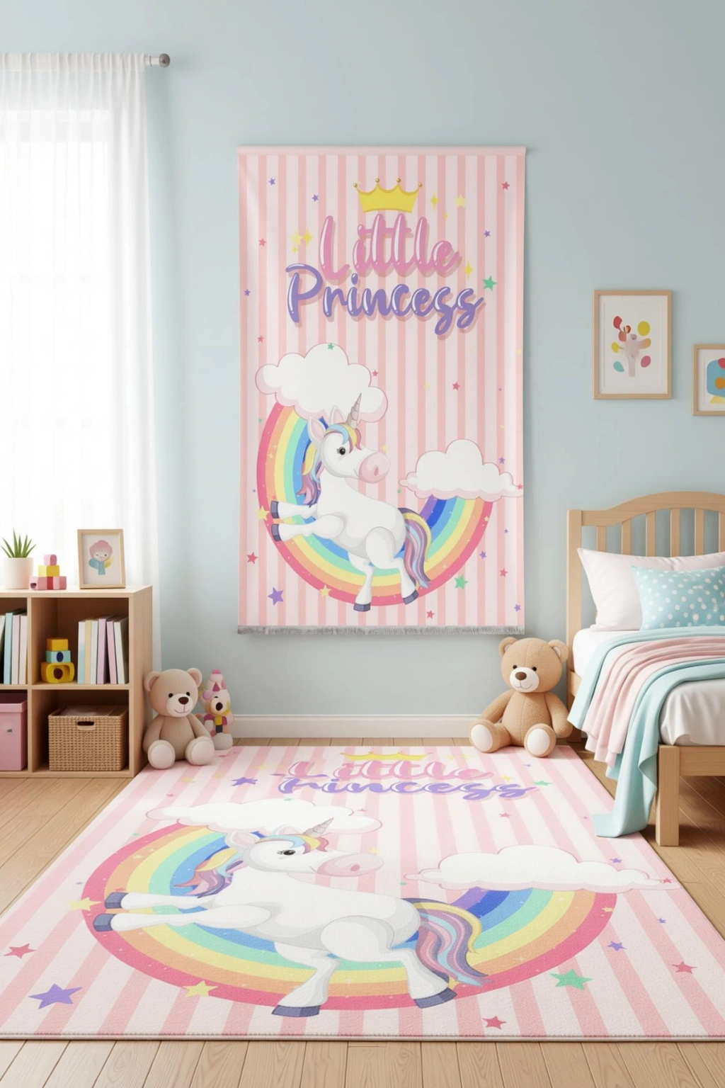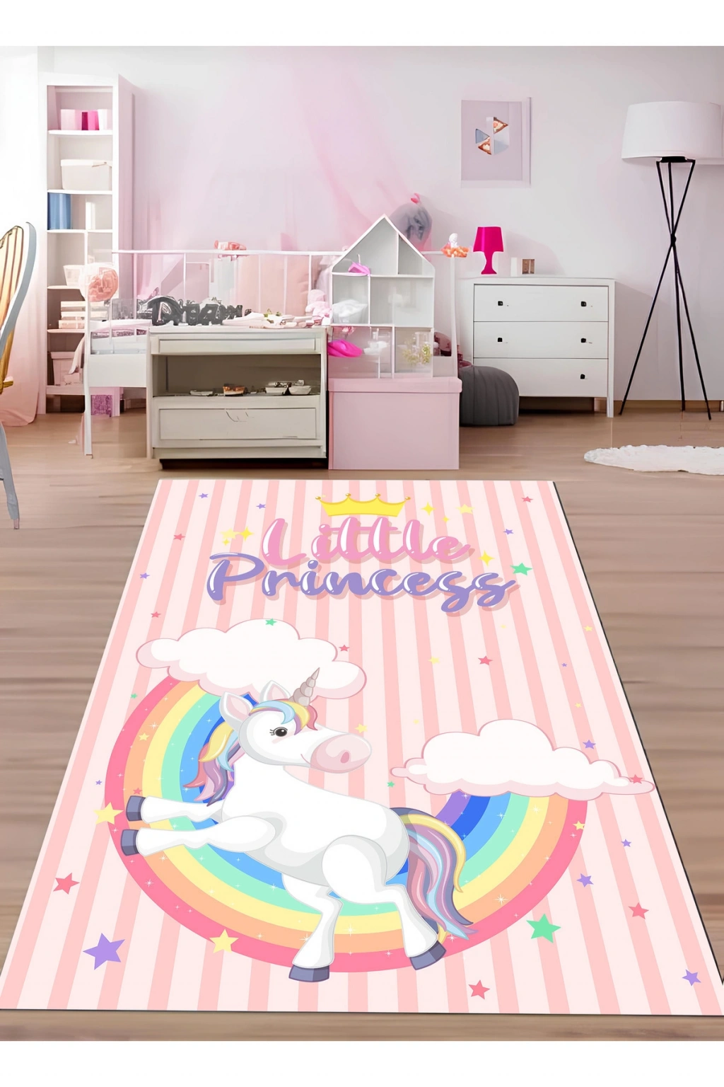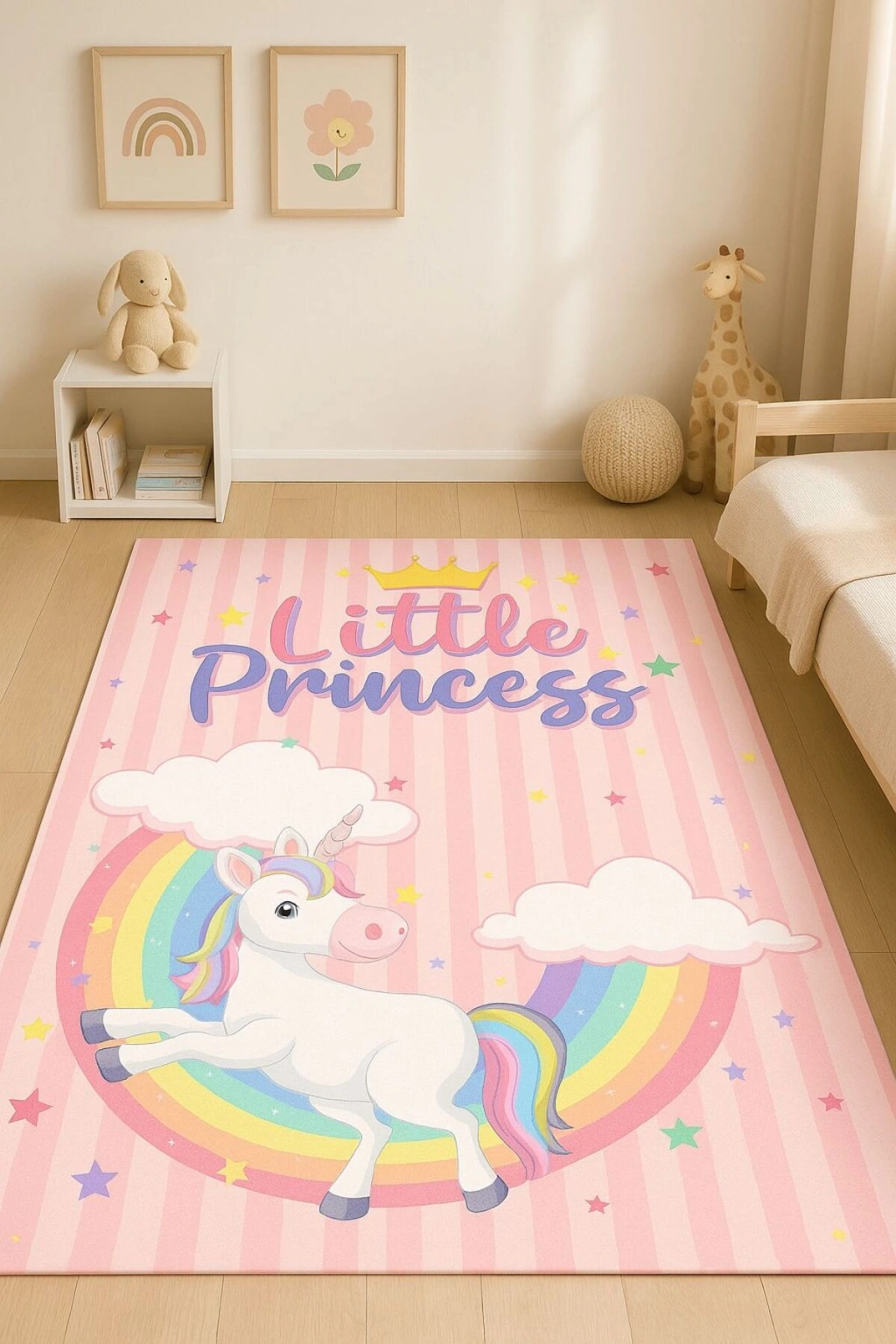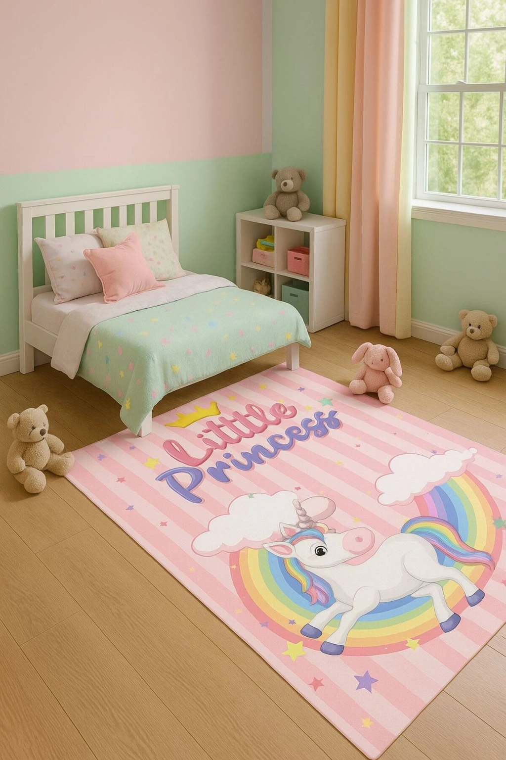 - Gökkuşağı desenleriyle süslenmiş, çocukların hayal dünyasına renk katan çocuk odası halısı.; - Dikdörtgen şekli ile her türlü oda düzenine uyum sağlayacak şekilde tasarlanmıştır.; - Figüratif tema ve stil, çocukların seveceği karakterlerle dolu bir atmosfer yaratır.; - Dayanıklı dokuma tabanı sayesinde uzun süreli kullanım sunar ve kolay temizlenebilirlik sağlar.; - Bambu materyali doğal bir hissiyat verirken aynı zamanda yumuşaklık ve konfor sunar.; - Düz saçak detayı ile modern ve şık bir görünüm kazandırırken, kenarların deforme olma riskini azaltır.; - Orta hav yüksekliği (6 - 12 mm),ideal konfor seviyesinde bir yürüyüş deneyimi vaat eder.; - Makine halısı üretim tekniği ile kalite standartlarına uygun olarak üretilmiştir; böylece uzun ömürlülük garantisi verir.; - Antibakteriyel özelliğiyle hijyenik bir ortam oluştururken alerjenlere karşı koruma sağlar.