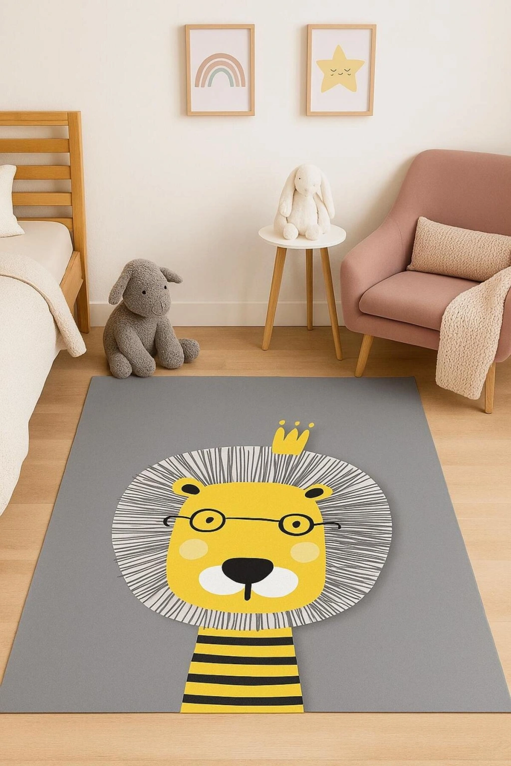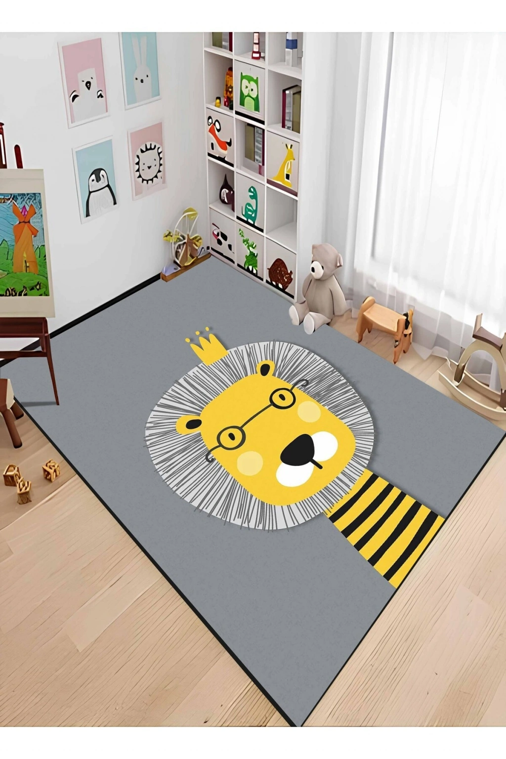 - Çocuk odası dekorasyonunuza şıklık katacak aslan figürleriyle süslenmiş, göz alıcı bir tasarım sunar.; - Dikdörtgen şekli sayesinde farklı oda düzenlerine kolayca uyum sağlar ve mekânınızı estetik bir şekilde tamamlar.; - Figürlü tema ve stil ile çocuk odasının atmosferini canlandırarak eğlenceli bir ortam oluşturur.; - Dayanıklı dokuma taban yapısı, uzun süreli kullanım için idealdir ve zeminde kayma riskini azaltır.; - Doğal bambu materyali ile hem çevre dostu hem de yumuşak bir dokunuş sağlar; çocuğunuzun ayaklarını rahat ettirir.; - Düz saçak detayı ile modern ve sade bir görünüm sergilerken aynı zamanda temizlik açısından pratiklik sunar.; - Orta hav yüksekliği (6 - 12 mm),konforlu bir yürüyüş deneyimi vaat ederken temizliğini kolaylaştırır.; - Makine halısı üretim tekniği sayesinde kalite standartlarına uygun olarak üretilmiştir; dayanıklılığı artırırken estetiği korur.; - Yıkanabilir özelliği ile leke tutmazlık ve kolay bakım avantajları sunarak ebeveynlerin hayatını kolaylaştırır.