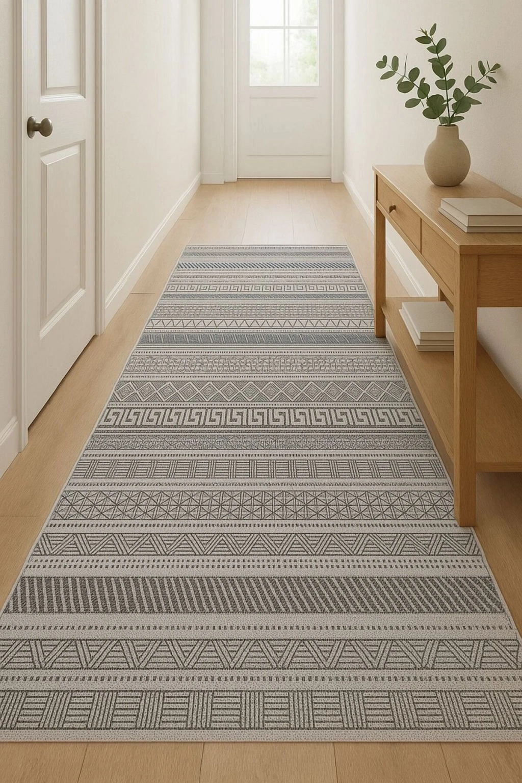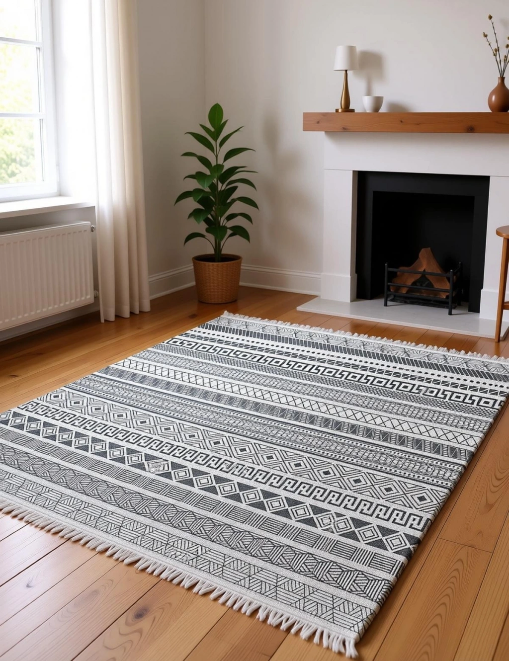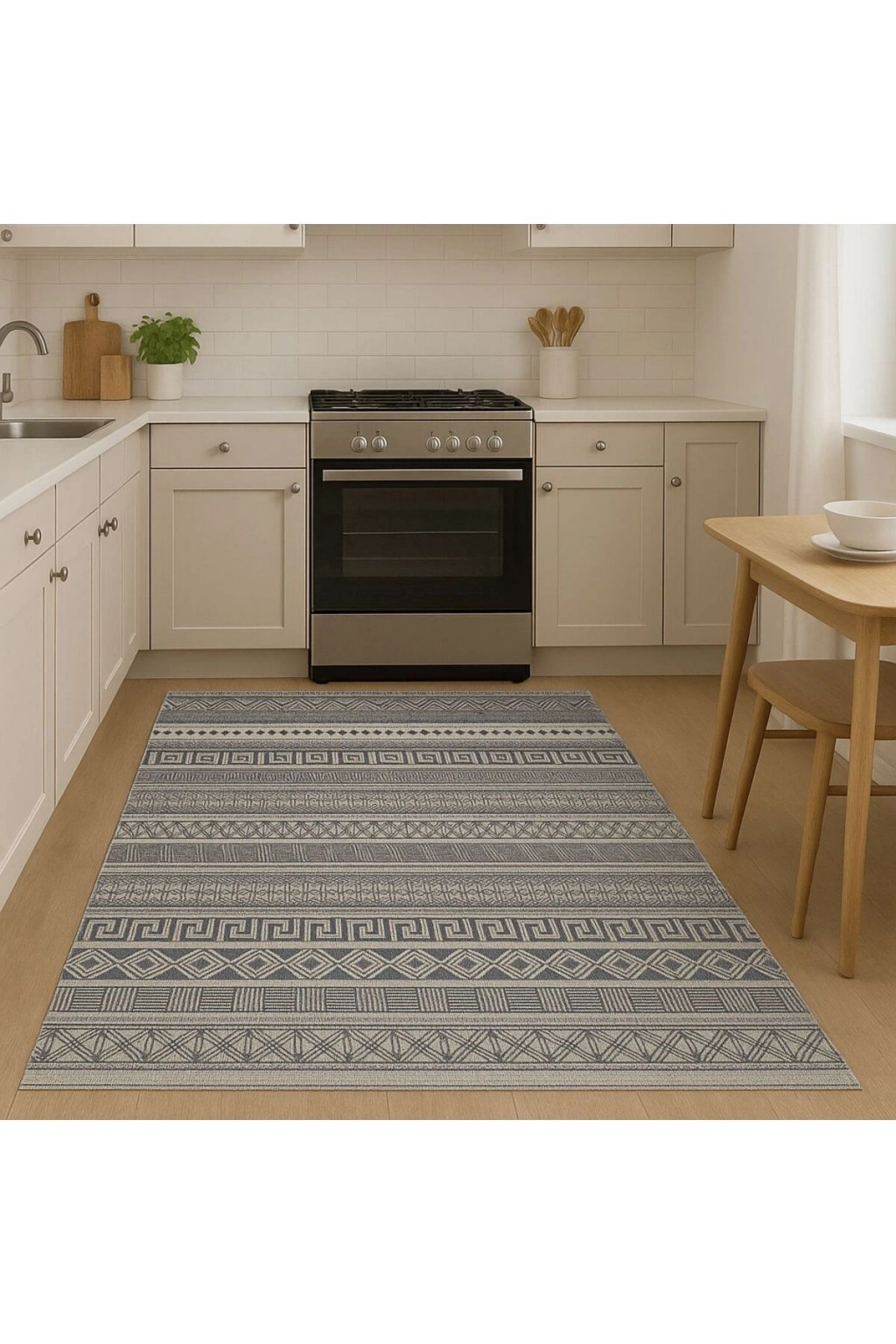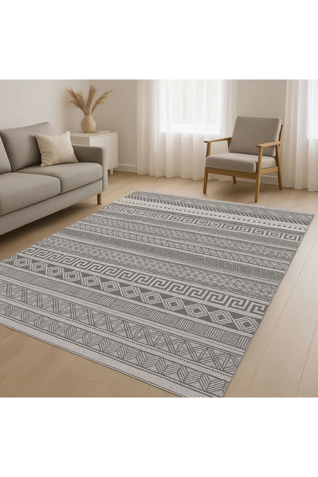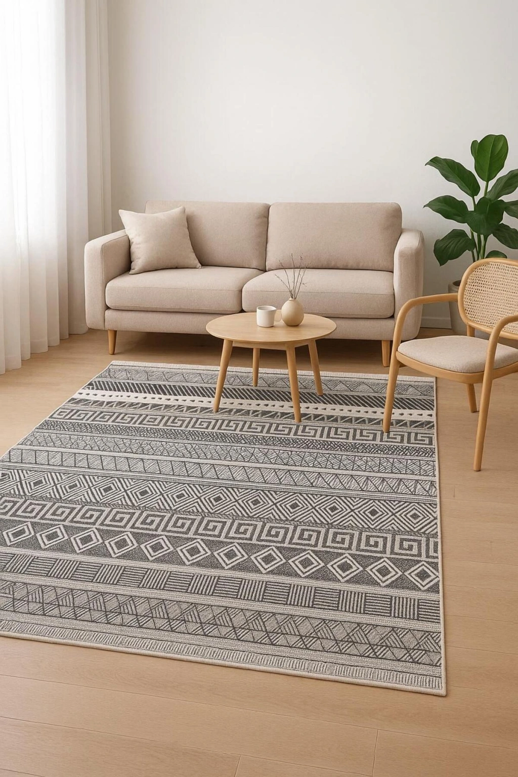 - Modern dekorasyonun vazgeçilmez parçası olan bu etnik desenli halı, salon veya oturma odanızda şıklığı ve konforu bir arada sunar.; - Dikdörtgen şekliyle mekanınıza kolayca uyum sağlar ve farklı boyutlardaki alanlarda estetik bir görünüm oluşturur.; - Makine halısı üretim tekniği sayesinde uzun ömürlü kullanım vaat ederken, düz saçak detayı ile modern bir dokunuş katmaktadır.; - Dokuma taban yapısı, dayanıklılığı artırarak halının formunu korumasına yardımcı olurken aynı zamanda yumuşak bir yürüyüş deneyimi sunar.; - Orta hav yüksekliği (6 - 12 mm),hem rahatlık hissi verir hem de temizlik açısından pratiklik sağlar; böylece zemininizi kolayca süpürmenize olanak tanır.; - Bambu materyali doğal bir hissiyat yaratırken aynı zamanda çevre dostu bir seçim olarak ön plana çıkar; bu da evinizdeki sürdürülebilirlik çabalarını destekler.; - Kaymaz taban özelliği sayesinde güvenliğinizi düşünerek tasarlanmıştır; kaygan zeminlerde bile maksimum güvenlik sağlar.; - Geniş kullanım alanı seçenekleri arasında yer alarak yaşam alanınızın her köşesine uygun şekilde adapte olabilirsiniz.;