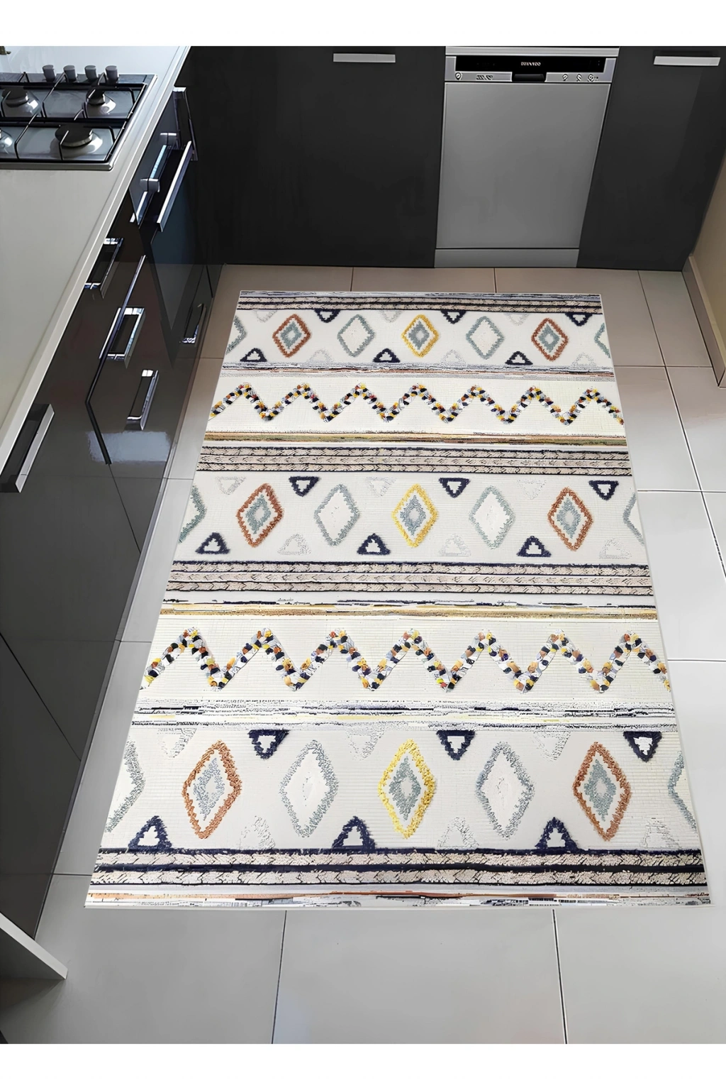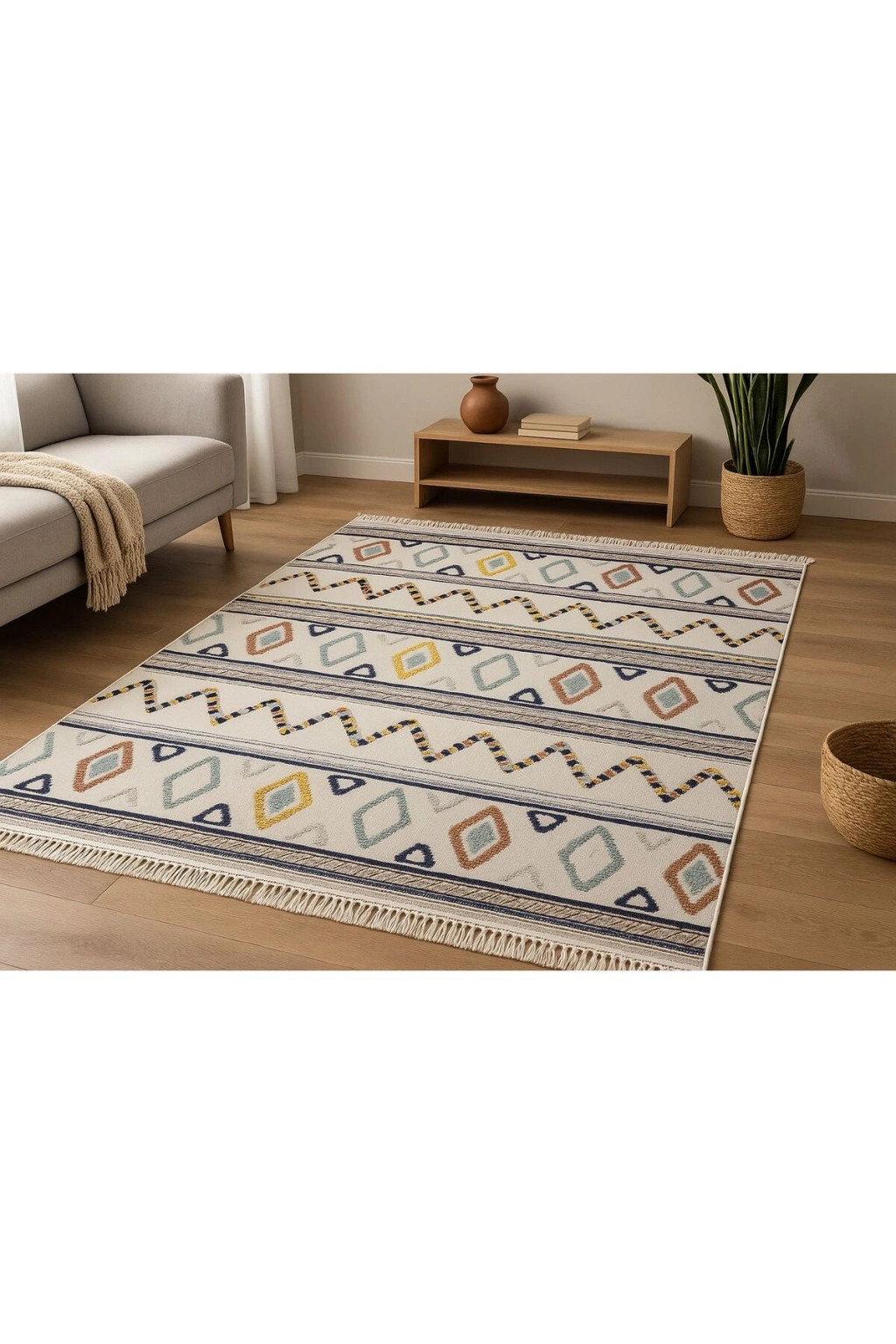 İskandinav motifleriyle süslenmiş renkli baklava desen tasarımı, modern ve şık bir dekoratif kilim arayanlar için idealdir.; Dikdörtgen şekli sayesinde antre veya hol gibi çeşitli alanlarda rahatlıkla kullanılabilir.; Makine halısı üretim tekniği ile üretilmiş olup, dayanıklılığı ve kalitesi ön planda tutulmuştur.; Düz saçak detayları ile sade ama etkileyici bir görünüm sunar; her türlü mekanla uyum sağlar.; Dokuma taban yapısı sayesinde zeminde sabit durur ve kayma riskini azaltır.; Orta hav yüksekliği (6 - 12 mm),konforlu bir dokunuş hissi verirken temizliğini kolaylaştırır.; Bambu materyali doğal bir dokunuş katarken aynı zamanda çevre dostudur; uzun ömürlü kullanım vaad eder.; İskandinav tema/stiliyle minimalist tasarım anlayışını yansıtır; evinizin atmosferine modern bir hava katar.; Kaymaz taban özelliği ile güvenliğinizi düşünerek tasarlanmıştır; hareket halindeyken maksimum güvenlik sağlar.;