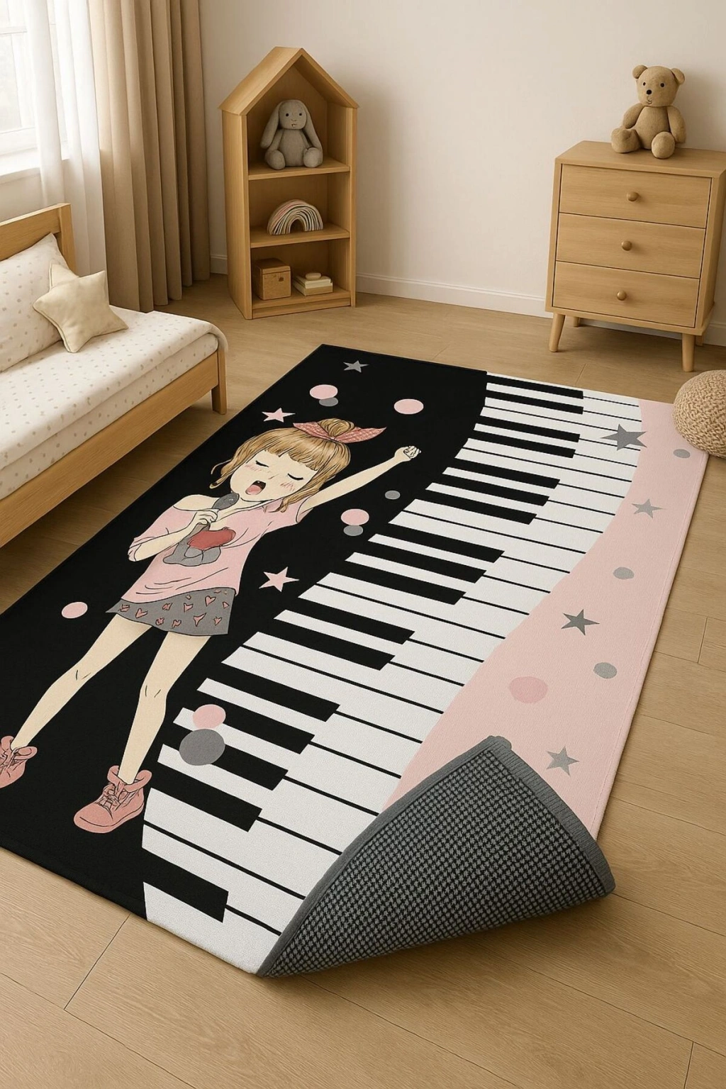 Dijital baskı teknolojisiyle üretilen figürlü deseni, odanın atmosferini eğlenceli hale getirir.; Antialerjik özelliğiyle alerjenlere karşı ekstra koruma sunarak çocuklarınızın güvenle oynayabileceği bir ortam yaratır.; Web color olarak belirtilen renk seçeneği, dijital baskının canlılığını yansıtarak görsel zenginlik katmaktadır.; Dokuma tabanlıdır Kaymaz tabanlıdır Makinede 30 derece de yıkanabilir Temizliği kolaydır Çocuk odası oyun halısı