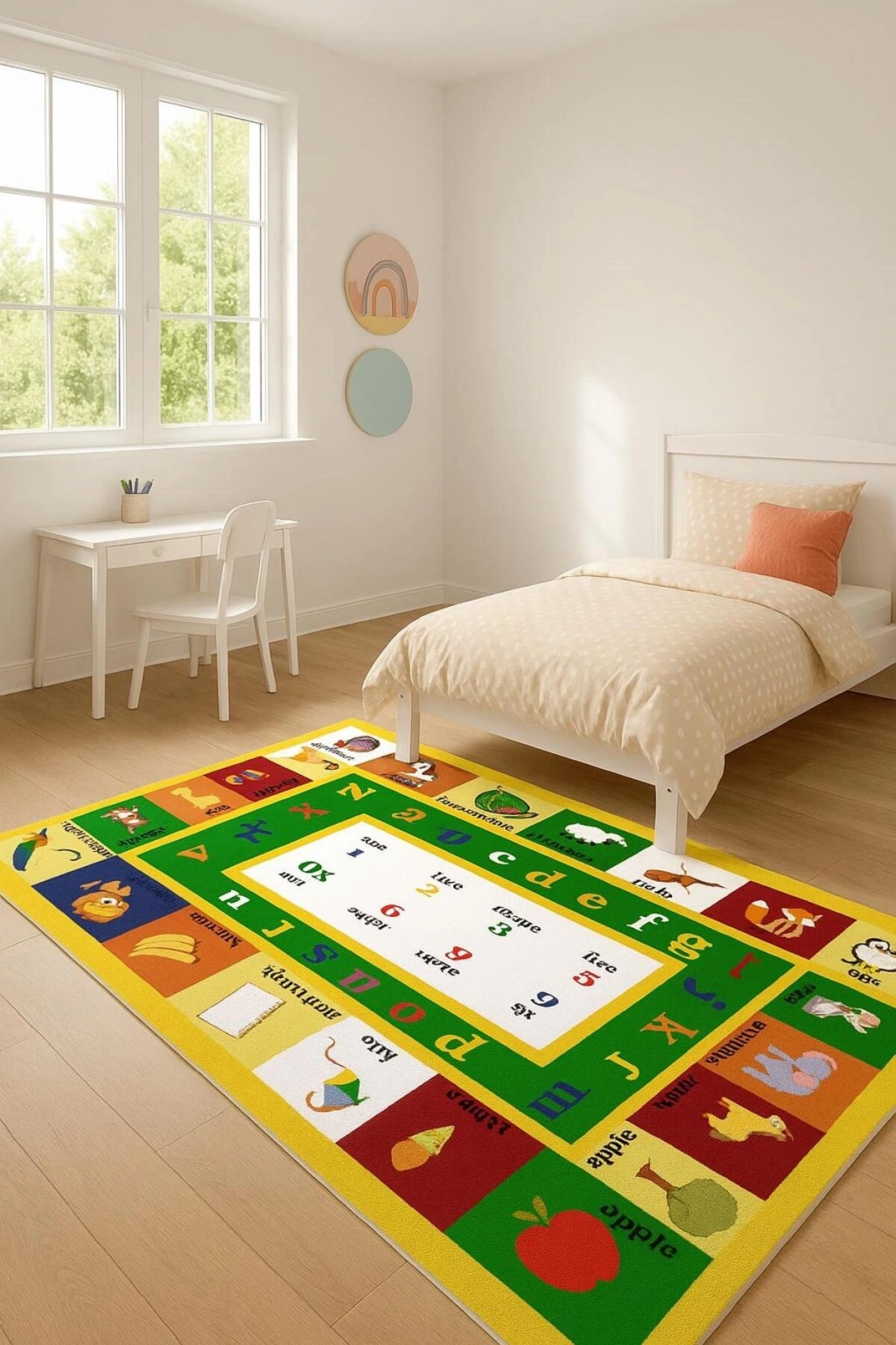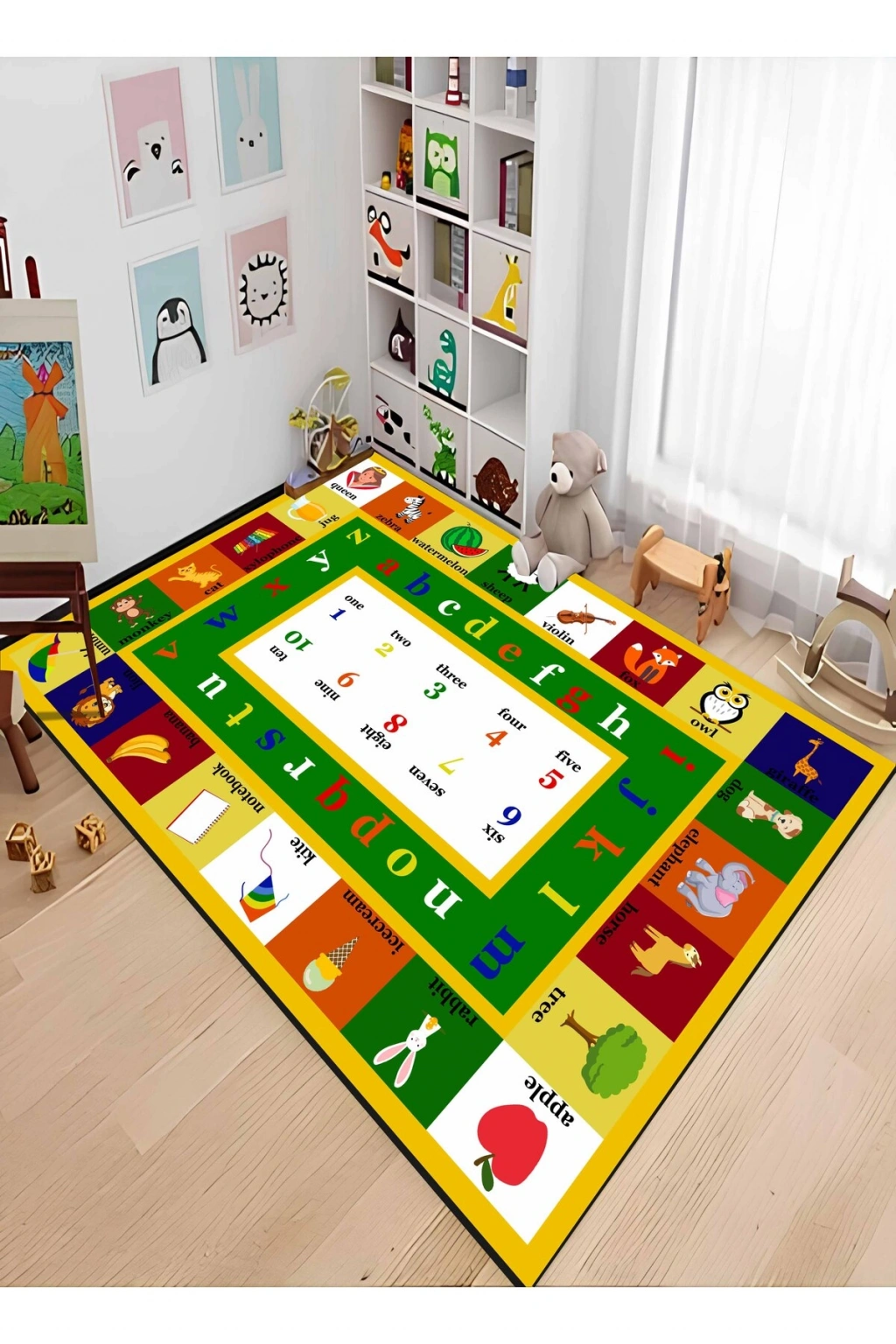 - Renkli figürlerle süslenmiş, çocukların hayal dünyasını genişleten eğitici çocuk odası halısı.; - Dikdörtgen şekliyle her oda düzenine uyum sağlayan pratik kullanım sunar.; - Figürlü tasarımıyla çocukların ilgisini çekerken, aynı zamanda dekoratif bir dokunuş sağlar.; - Dokuma taban yapısı sayesinde dayanıklılığı artırılmış ve uzun ömürlü kullanım vaat eder.; - Bambu materyali ile doğal bir hissiyat sunarken, çevre dostu bir seçimdir.; - Düz saçak detayları ile modern ve şık bir görünüm kazandırırken, kolay temizlenebilirlik sağlar.; - Orta hav yüksekliği (6 - 12 mm),konforlu bir yürüyüş deneyimi ve yumuşaklık sunar.; - Makine halısı üretim tekniği ile kalite standartlarına uygun olarak üretilmiştir; böylece herhangi bir sorun karşısında profesyonel destek alabilirsiniz.; - Antialerjik özelliği ile çocuklarınızın sağlığını düşünerek tasarlanmıştır; alerjenlere karşı koruma altına alınmış olup ev ortamında güvenli bir atmosfer oluşturur.